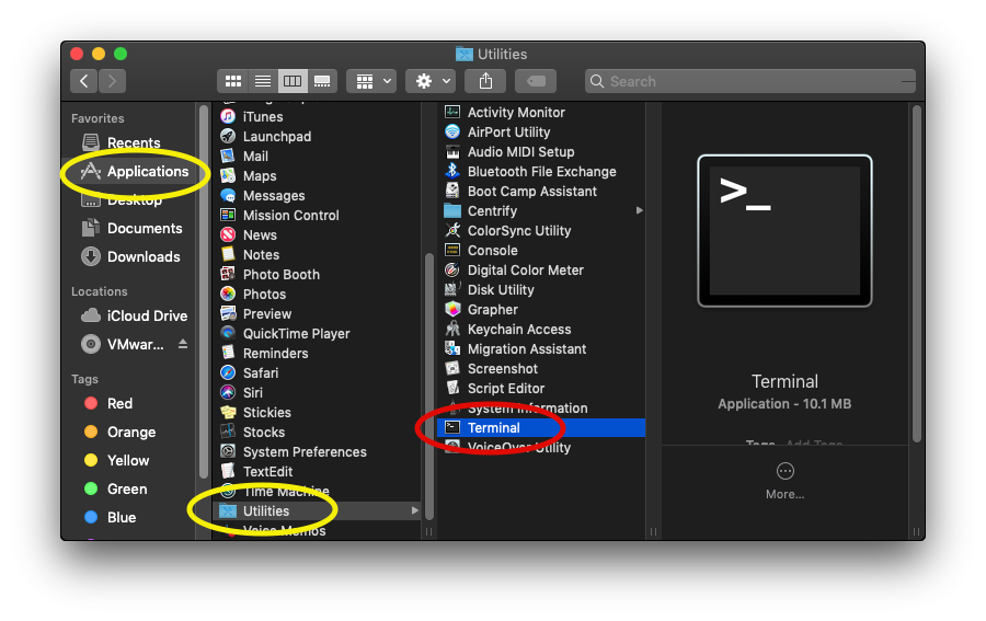 - In the Finder, Navigate to /Applications/Utilities double click on the Terminal application