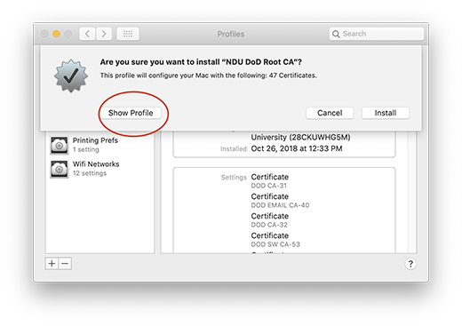Follow these steps to install the NDU DoD Certificate Authority Configuration Profile