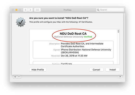 Just as the vast majority of commercial websites utilize public key cryptography to encrypt their websites (i.e. Google, Apple, Amazon) so too does NDU and the DoD rely heavily on the use of certificates to secure communications. Unlike commercial sites however, the DoD's certificate infrastructure is not by default trusted by modern day operating systems. NDU has created an Apple Configuration Profile for end users to install that will place the DoD's Root CA and Intermediate CA's onto your Apple device. It will also by default automatically trust these certs when accessing DoD sites, as well as connecting to NDU's wireless network (macOS only)